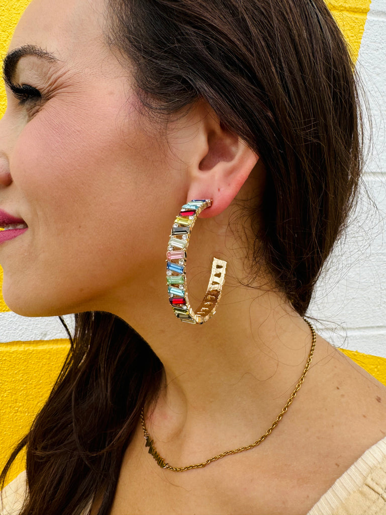 We. Cannot. Get. Over. These. These hoops feature an array of different colored emerald cut stones. Perfect for everyday wear, and holiday wear! Matches nearly any outfit!