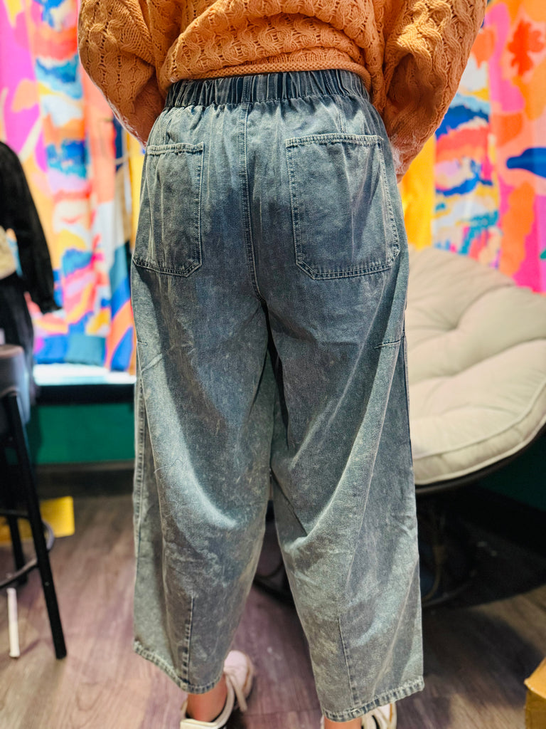 If you're looking for comfort, here it is! These jeans are so fun. Elastic waistband with drawstring on top. Flowy fit in the legs.