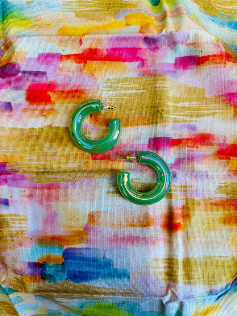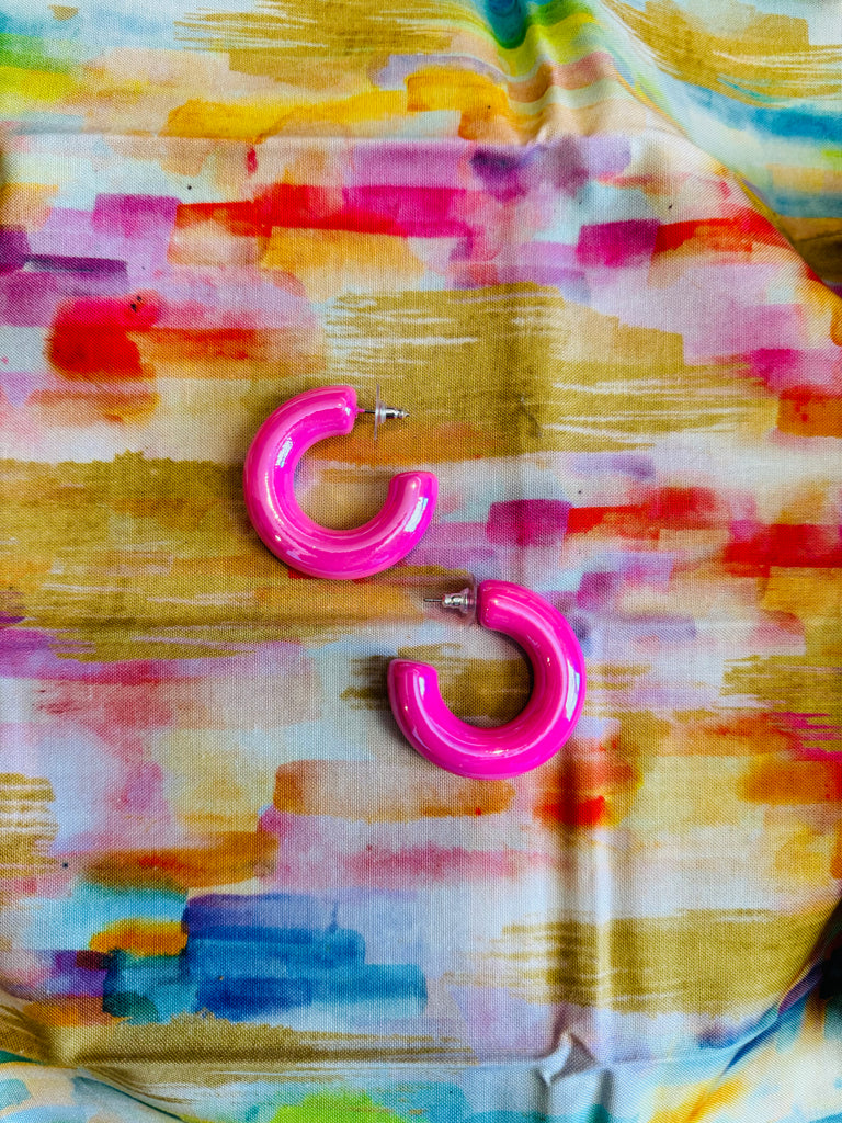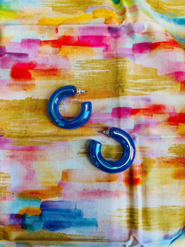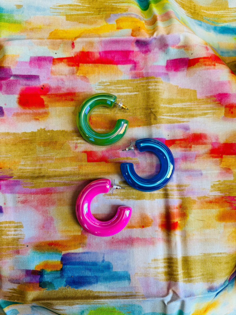 It's a blast from the past with these bright neon hoops! Iridescent coated and available in three fun colors.