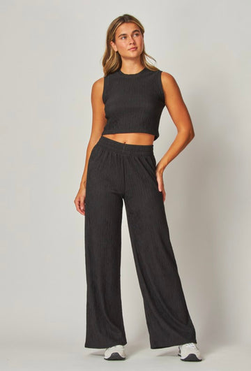 -Crinkle Textured fabric -Sleeveless crop tank top -Elastic waistband pull on wide leg pants Model is wearing a size medium