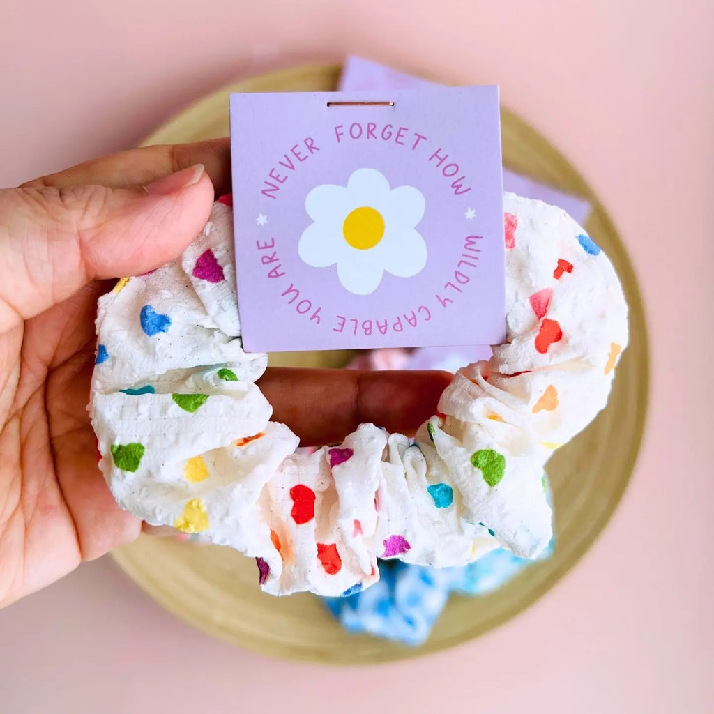 "Never Forget How Wildly Capable You Are" Daisy Fun and Cute Scrunchies. Hand-made scrunchies make the best thank you gifts, especially in pastel pinks and blues, perfect for a little inspirational message. Makes a perfect little Easter or Mother's Day gift, basket stuffer, or thank you gift for girls, teens, and women. Hair accessory for all women.