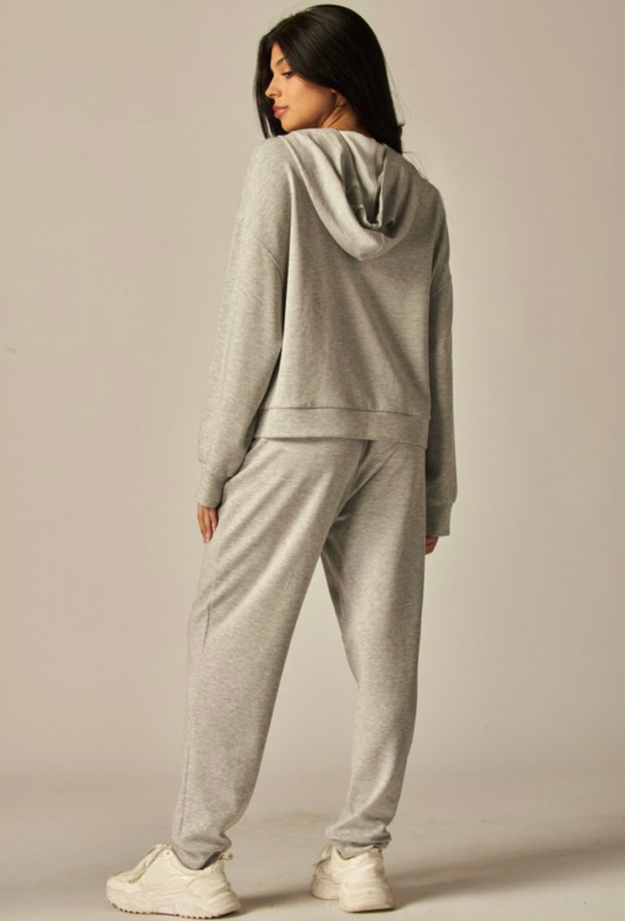Super soft sweater and jogger set! 46% cotton, 50% polyester, 4% spandex. Heather grey color