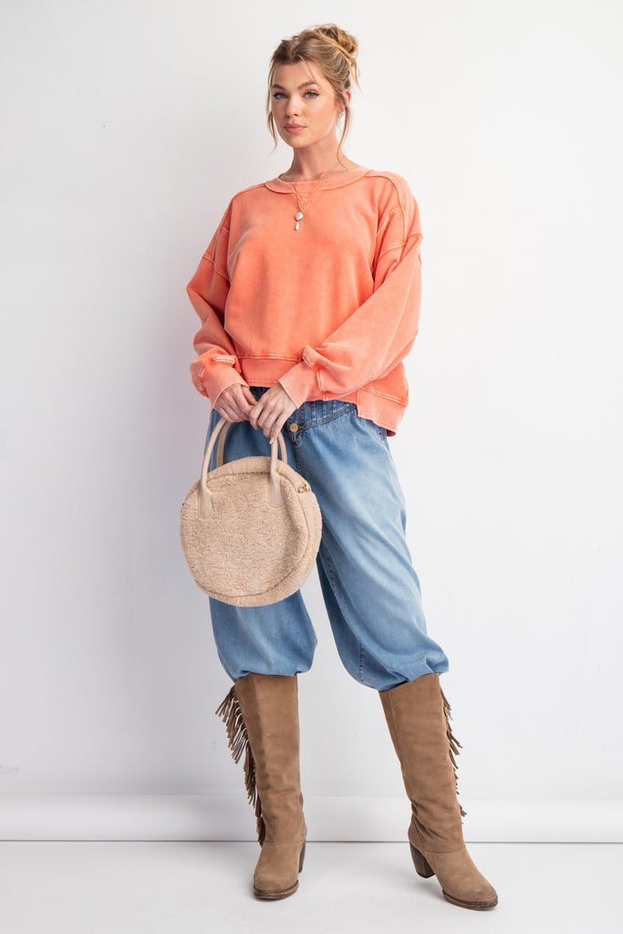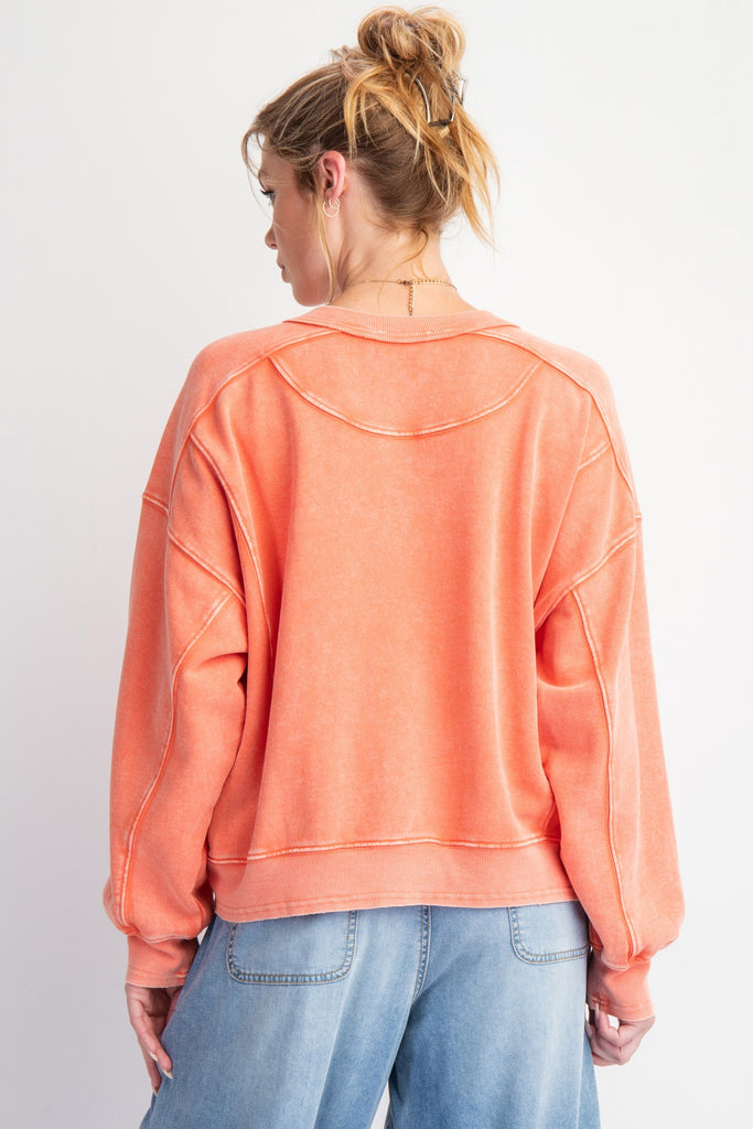 -DROPPED SHOULDERS -ROUNDED NECKLINE WITH V STITCH -RIBBED BAND CUFFS AND HEM -UNEVEN HEM -DEFINED SEAMS -RELAXED AND LOOSE FIT -SMALL MEASUREMENTS : LENGTH - 22.5" & BUST - 27.5" & SLEEVE - 19"