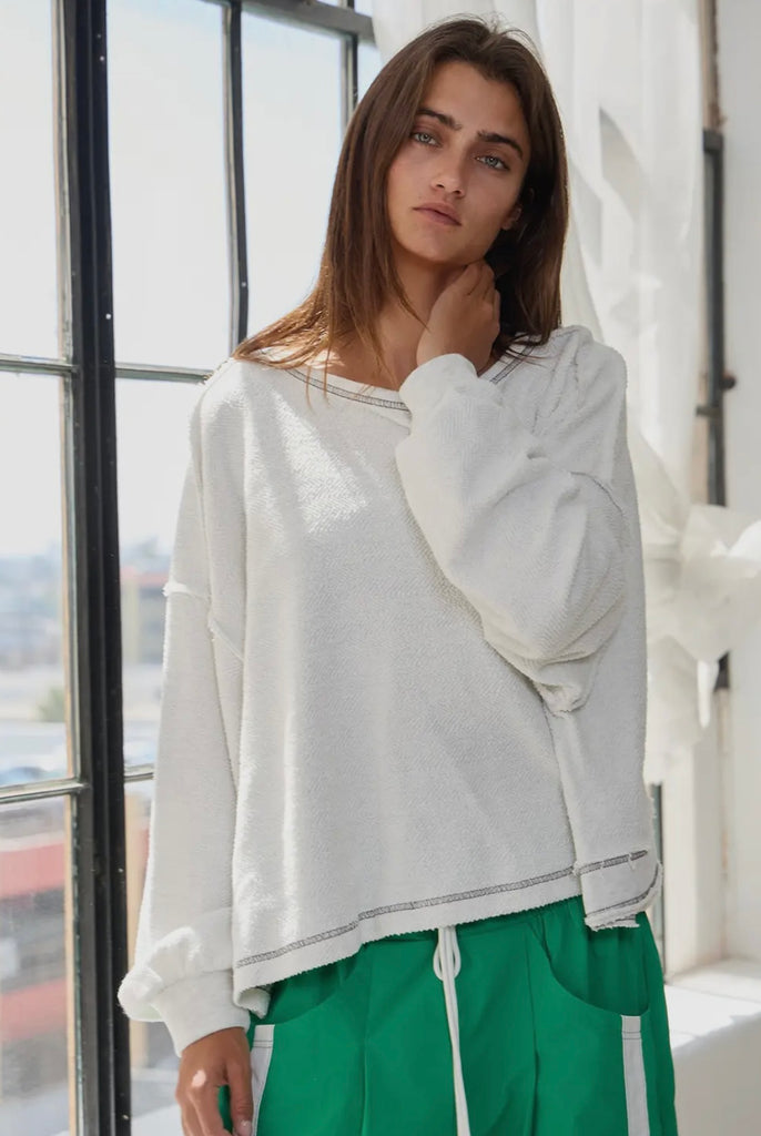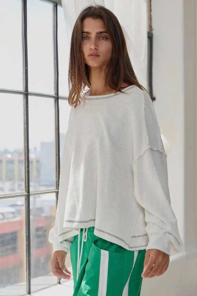 74% cotton, 26% polyester. Long drop shoulder sleeves. Overlap open back. Oversized fit. Hand wash.