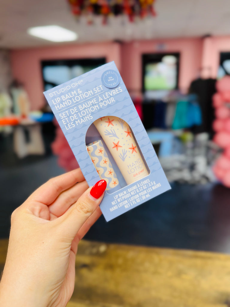 These sets include a 1 oz hand cream and lip balm packaged in a clear, reusable pouch!