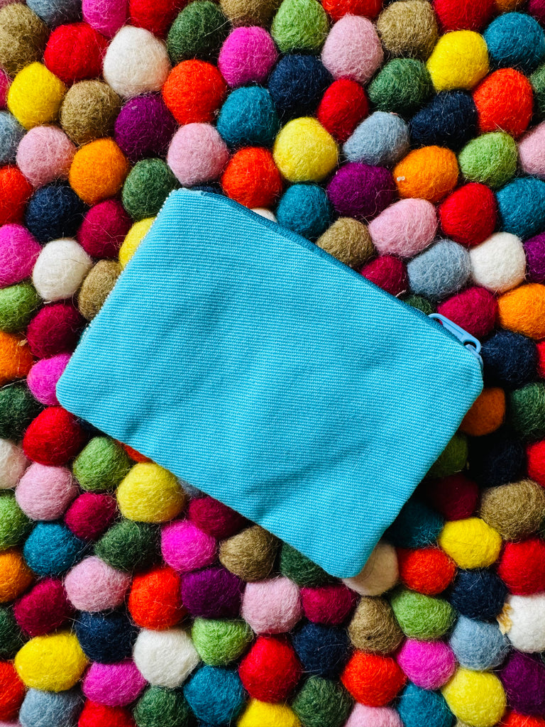 This coin purse fits in almost any bag! It features a vibrant and fun pineapple with sunglasses and palm trees design and a solid turquoise back.